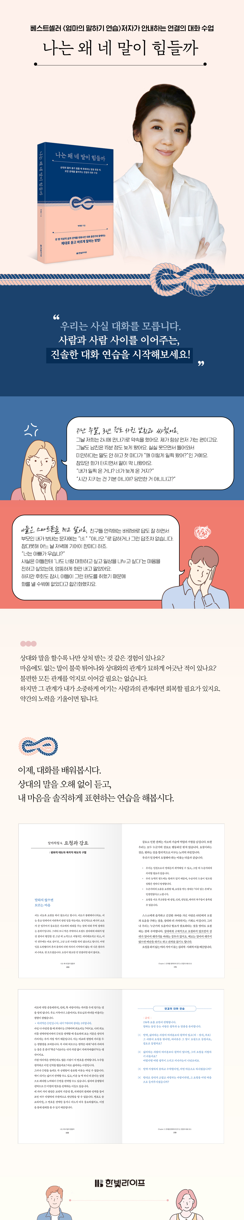 단계별 연습과 풍부한 사례를 통해 일상에서 말로 인해 얼마나 많은 관계가 틀어지는지를 반추해보고, 말하는 방법이나 상대의 말을 듣고 반응하는 방식을 살짝만 바꾸어도 충분히 관계의 변화를 가져올 수 있다는 것을 독자 스스로 깨달을 수 있도록 도와준다. 15만 독자가 선택한 《엄마의 말하기 연습》 저자이자 천여 명의 삶을 바꾼 대화 훈련가의 친절한 코칭으로 제대로 듣고 바르게 말하는 방법을 배울 수 있을 것이다.