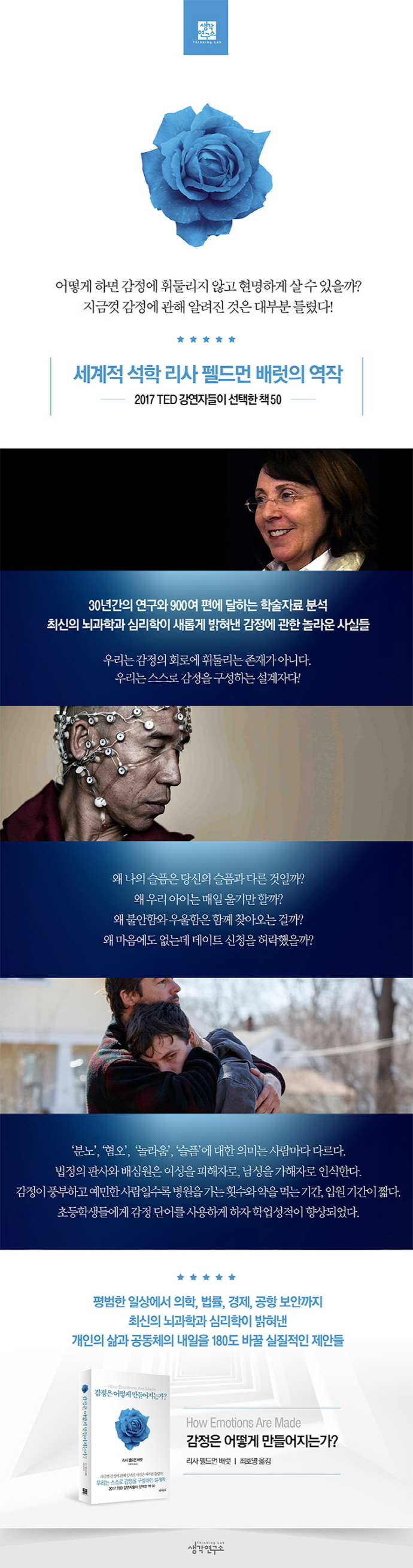 저자 리사 펠드먼 배럿은 노스이스턴대학의 심리학 석좌교수이자, 하버드 의과대학원과 매사추세츠 종합병원 정신의학과와 엑스선과 의사로도 재직 중이다. 〈사이언스〉, 〈네이처 뉴로사이언스〉를 비롯해 심리학 및 인지 신경과학 분야 최고의 저널들에 과학논문을 발표했으며, 〈길퍼드 프레스〉를 통해 6권의 책을 출간했다. 미국국립보건원에서 뇌와 감정에 대한 획기적인 연구 업적을 인정받아 파이어니어 어워드NIH Director’s Pioneer Award를 수상했다. 또한 미 의회와 FBI에서 자신의 과학적 성취들에 대해 발표하고, 국립암연구소의 컨설팅을 담당했다. 한편 사이언스 채널에서 방영한 ‘웜홀을 지나서Through The Wormhole’를 비롯해 공영방송과 세계 여러 나라의 라디오 프로그램에 출연하는 등 과학의 대중화에 힘쓰고 있다. 가장 뛰어난 철학자에게 주어지는 캐나다 왕립학회 펠로우로 선출되기도 했다. www.lisafeldmanbarrett.com